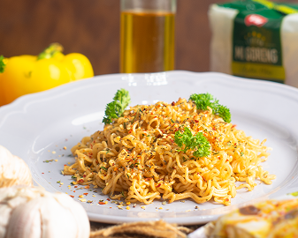 Traditionally prepared in Italy, Aglio Olio is thought to have originated in the Naples region of the country's south. It is essentially spaghetti with garlic and olive oil, and it is sometimes referred to as a cheaper alternative to pasta with mussels. Choosing a instant noodle, garlic, olive oil, and red pepper flakes are the only things needed to produce Vit’s Italian Mi Goreng Aglio Olio